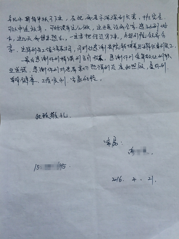 “感謝你們精湛的醫療技術,感謝你們愛崗敬業的職業道德,感謝你們對患兒親切熱情的態度和照顧,愿你們身體健康,工作順利,家庭和睦”。